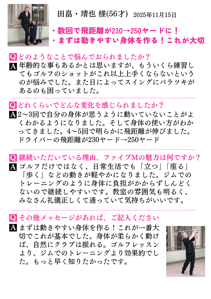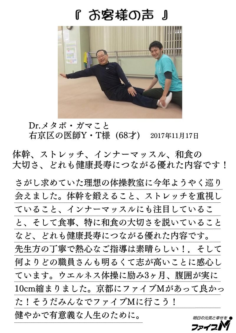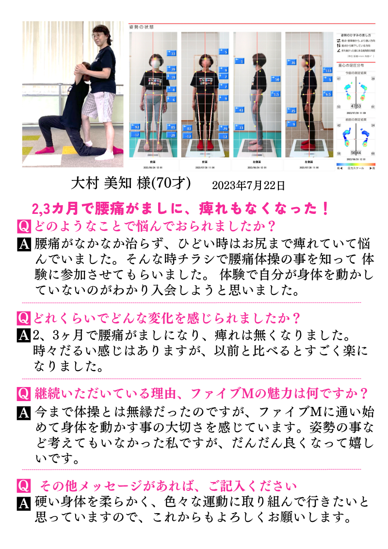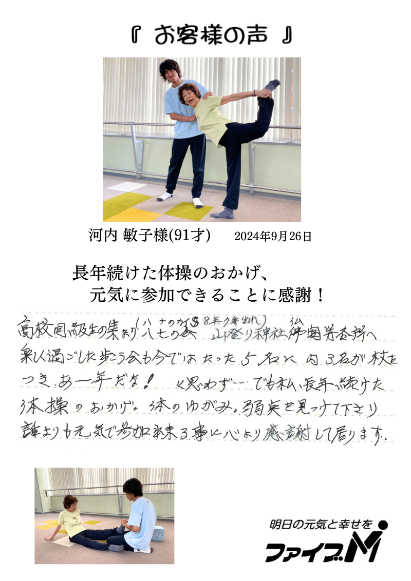 ファイブMの会員様は、時が止まっているように思います。お越しの時から歳をとられないんです。続ける事ってすごいな!体操の力ってすごいな!と日々間近で感じさせて頂いてます。