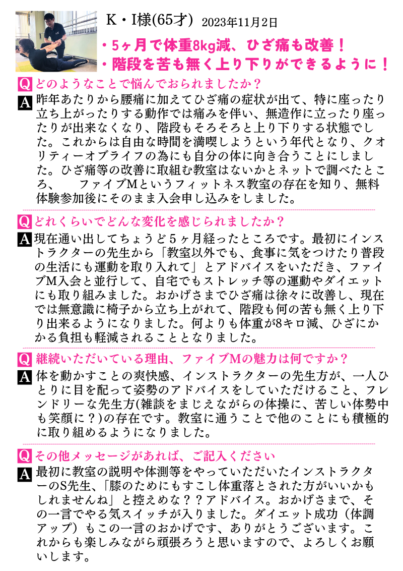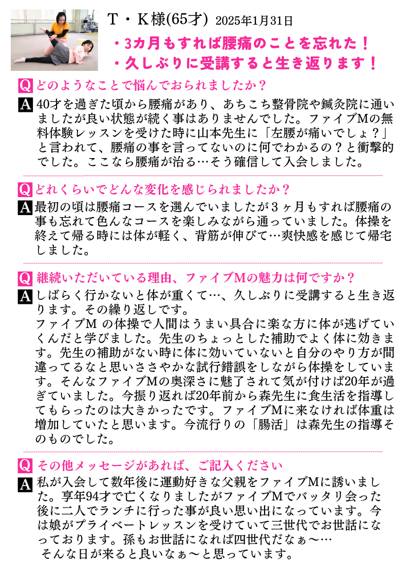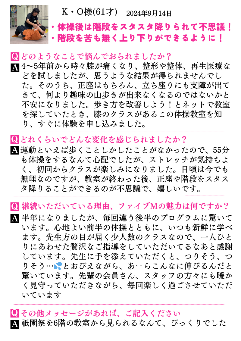 運動経験はウォーキングぐらいしか経験がなく、55分の体操が心配でしたが、ストレッチが気持ちよく、初回からクラスが楽しみになられたそうです。半年程度で、レッスン後には正座ができ階段もスタスタ降りられるになられました。