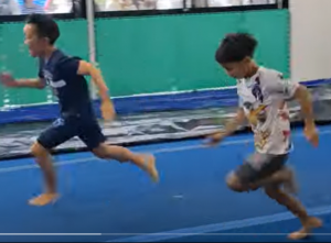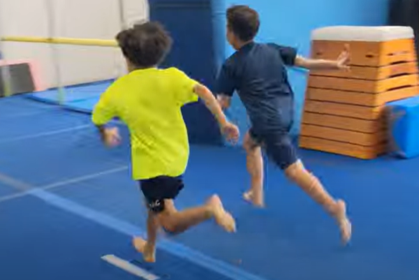 腕降りのフォームと体重を乗せて加速することを覚え、弾むように走る力を身につけていきます。